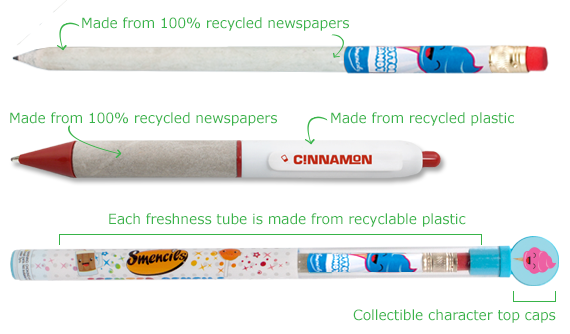 Being responsible for the environment is an important part of doing business in today’s world. That’s why the materials and processes that go into making Smencils and Smens are healthy for the environment. In manufacturing Smencils and Smens, recycled newspapers, environmentally friendly fragrances, recyclable plastic, and biodegradable erasers are utilized. The scents used to make Smencils and Smens are the same as those used to make soaps and candles, which are safe for reasonable personal use as tested by the manufacturers. By using recyclable plastic tubes, even our packaging is environmentally friendly.