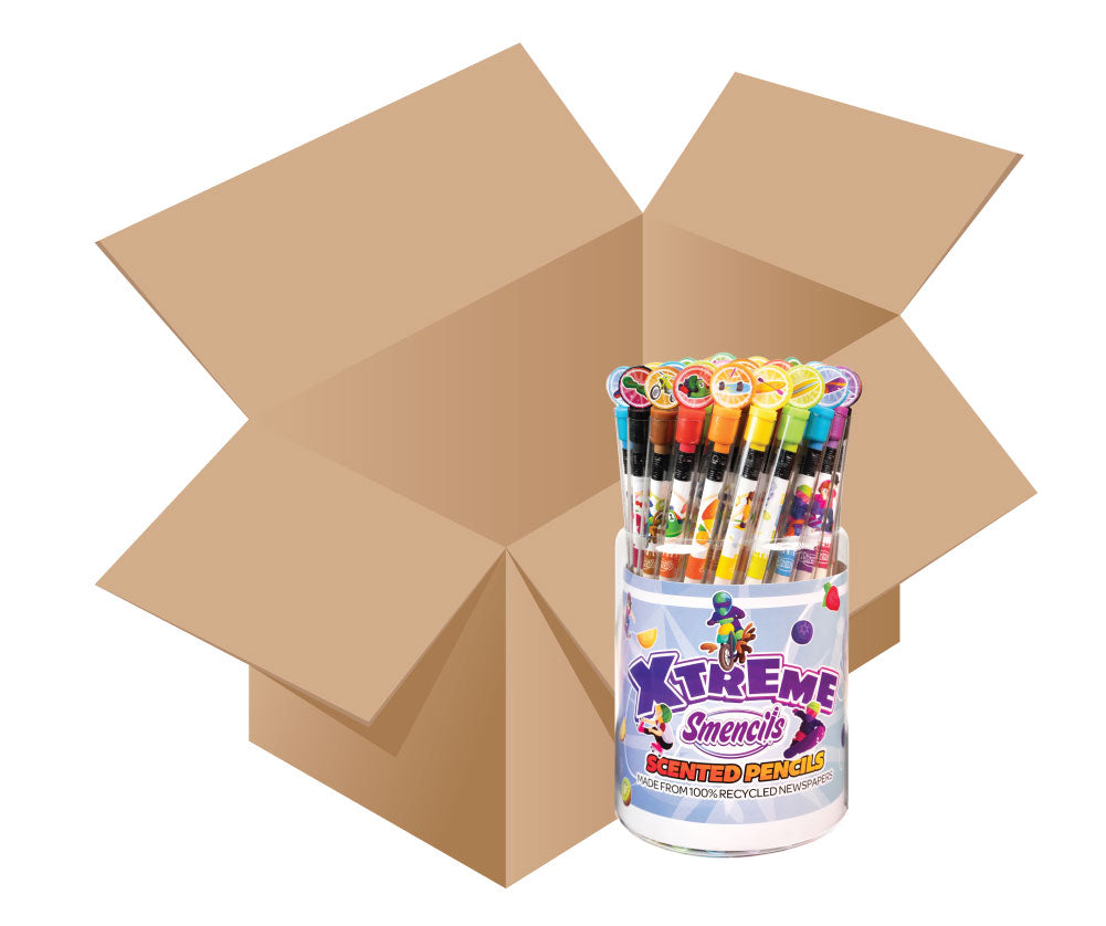 The Case of 10 X-Treme Sports Smencils Buckets includes 10 buckets of 50 gourmet scented X-Treme Sports pencils that are made from 100% recycled newspaper. Each X-Treme Sports Smencil is packaged in its own corn-based biodegradable plastic freshness tube. You will receive 5 each of the 10 scents per bucket.