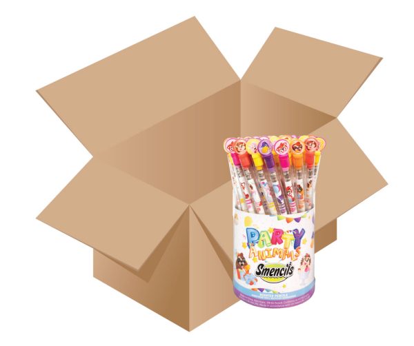 The Case of 6 Party Animals Smencils Buckets includes 6 buckets of 50 gourmet scented Party Animals pencils that are made from 100% recycled newspaper. Each Party Animals Smencil is packaged in its own corn-based biodegradable plastic freshness tube. You will receive 10 each of the 5 scents per bucket.