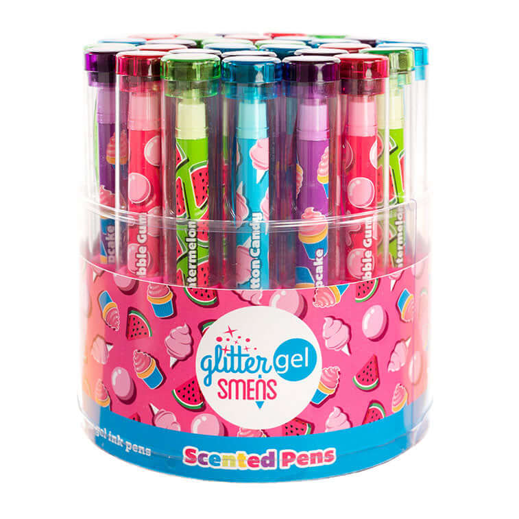 The Glitter Gel Smens Bucket of 32 includes 50 of our scented pens. Each bucket comes with 32 Smens. You will receive 8 each of the 4 scents per bucket.
