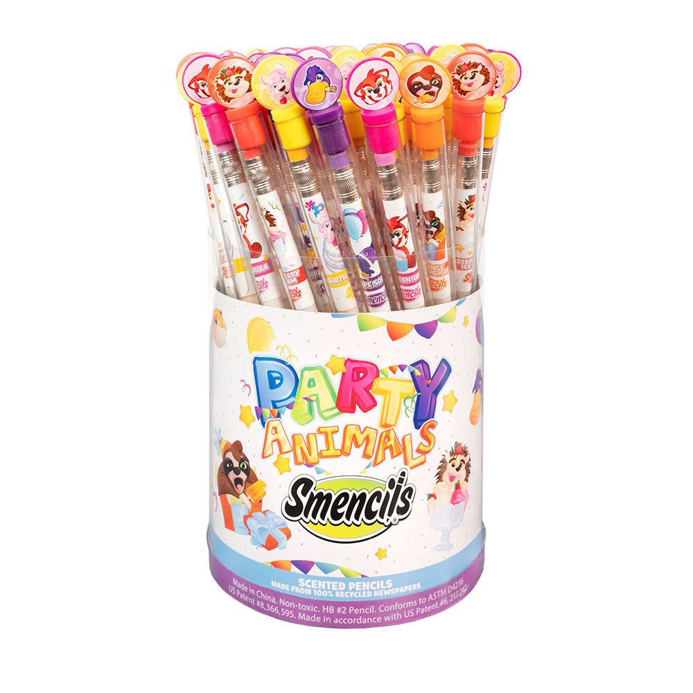 The Party Animals Smencils Bucket includes 50 of our scented pencils that are made from 100% recycled newspaper. Each Smencil is a No.2 pencil and packaged in its own recyclable plastic freshness tube that includes a collectible character top cap! Each bucket comes with 50 Smencils. You will receive 10 each of the 5 scents per bucket.